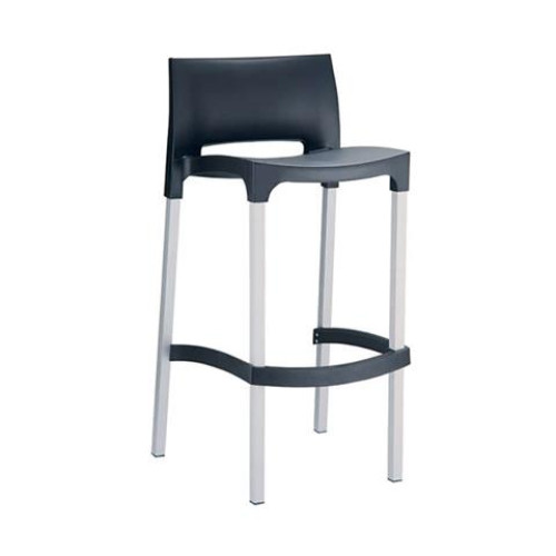 Σκαμπό GIO του οίκου Siesta σε μαύρο χρώμα,κατασκευασμένο από πολυπροπυλένιο ενισχυμένο με 20% fiber glass και πόδια από ανοδειωμένο αλουμίνιο 25x25mm,για απόλυτη αντοχή στον χρόνο.Κατάλληλο για εσωτερική και εξωτερική χρήση,στοιβαζόμενο σε πολλά χρώματα,ιδανικό για επαγγελματική χρήση.