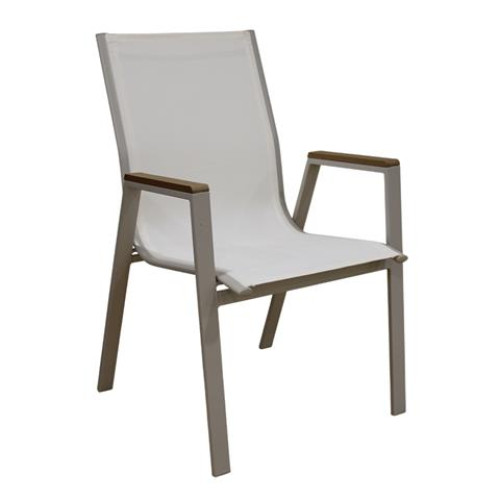 Selby πολυθρόνα με μεταλλικό σκελετό βαφής σε χρώμα cappuccino.Η πλάτη και το κάθισμα είναι από textilene χρώματος white. Τα ξύλινα πλαίσια που διαθέτει στα μπράτσα προσθέτουν στο κάθισμα μια ιδιαίτερη κομψότητα. Ένα άνετο κάθισμα, όπου θα απολαμβάνετε την ξεκούραση σας στον κήπο ή την βεράντα σας.
