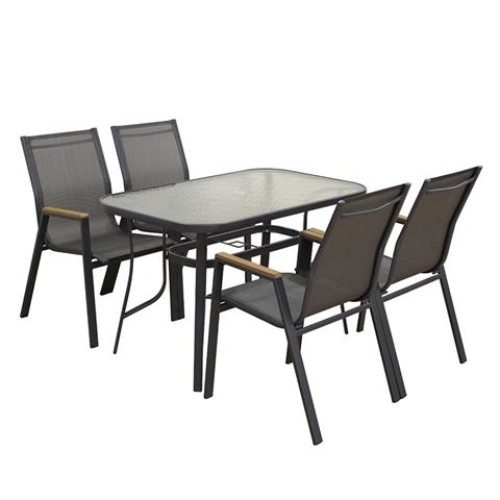 Selby set με μεταλλικό σκελετό σε χρώμα ανθρακί. Το σετ αποτελείται από 4 πολυθρόνες και 1 τραπέζι με γυαλί ασφαλείας. Ένα σετ κατάλληλο για τον κήπο ή την βεράντα σας.