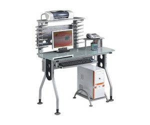 Γραφείο υπολογιστή,μεταλλικό μοντέρνου σχεδιασμού με σκελετό βαφής και επιφάνεια με γυαλί ασφαλείας αμμοβολής.Με δύο έξτρα υπερυψωμένα ράφια και θήκες για CDS.Διαθέτει συρόμενη βάση πληκτρολογίου και έξτρα βάση για τον πύργο του υπολογιστή.