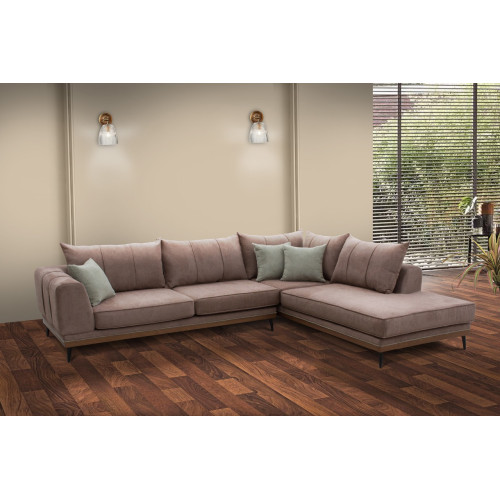 Γωνιακός καναπές με ιδιαίτερο σχέδιο στο μπράτσο και την πλάτη. Τα μαξιλάρια καθίσματος και τα μαξιλάρια πλάτης έχουν διακοσμητικές λεπτομέρειες. Η βάση αποτελείται από ύφασμα και ξύλο με διακοσμητικά στοιχεία ενδιάμεσα.