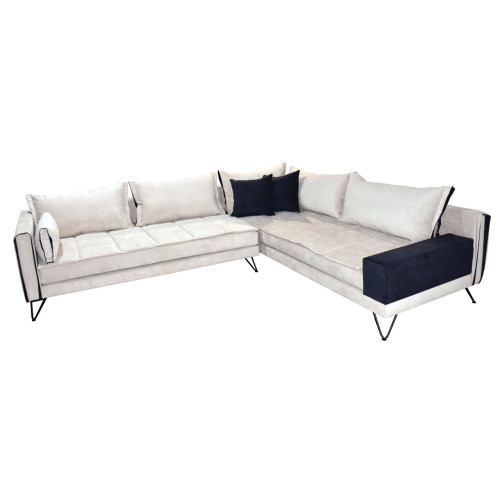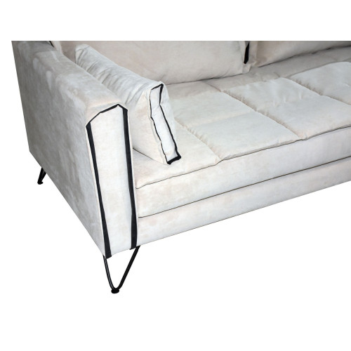 Κάθισμα με μαξιλάρι και επιπλέον καπιτονέ ανώστρωμα. Διακοσμητικές λεπτομέρειες με ρέλι στο σκελετό και τα μαξιλάρια πλάτης. Το ύφασμα, τα χρώματα, οι διαστάσεις και η φορά του καναπέ μπορούν να αλλάξουν ανάλογα με τις ανάγκες σας.